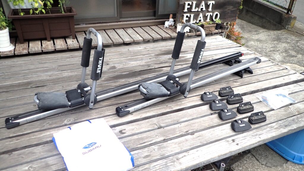 スバル「レヴォーグ」に取り付けられていたカヤックキャリア一式です。